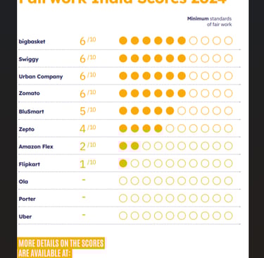 Introduction The rise of gig and platform work in India has been a critical development in recent years, significantly altering traditional employment structures. The reliance on digital labor platforms—such as food delivery, ride-hailing, and logistics—has expanded access to employment for many workers. However, the absence of adequate regulatory frameworks has raised concerns about working conditions, particularly regarding pay equity, worker safety, and representation. The 2024 Fairwork India report provides a comprehensive evaluation of these issues, utilizing a five-principle framework to score platforms on labor standards. This paper analyzes the key findings of the report, offering insights into the current state of the platform economy and recommendations for future improvements.