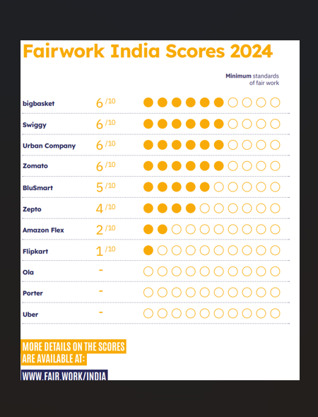 The 2024 Fairwork India report evaluates labor standards across 11 digital platforms operating in India. The report benchmarks platforms against five principles: Fair Pay, Fair Conditions, Fair Contracts, Fair Management, and Fair Representation.